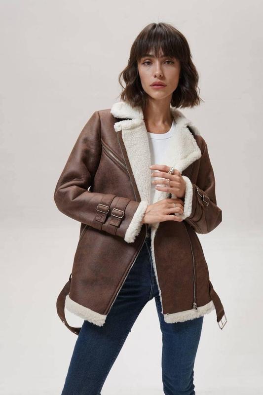 В идеальном новом состоянии. Материал - эко-овчина на замше, экокожа. Фурнитура серебряная. Размер XS - плечи 40, рукав 64, длина 70, бюст 74-84, талия 52-62