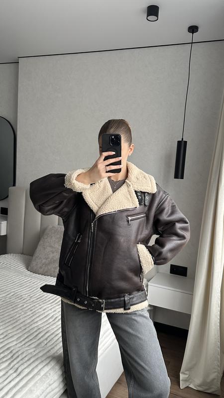 шоколадна дублянка з еко хутра🤍 size: s ml material: еко дублянка зйомний ремінь та робочі кишеньки, хутро не линяє 🏷️ 2200 гривень на фото одягнений розмір м