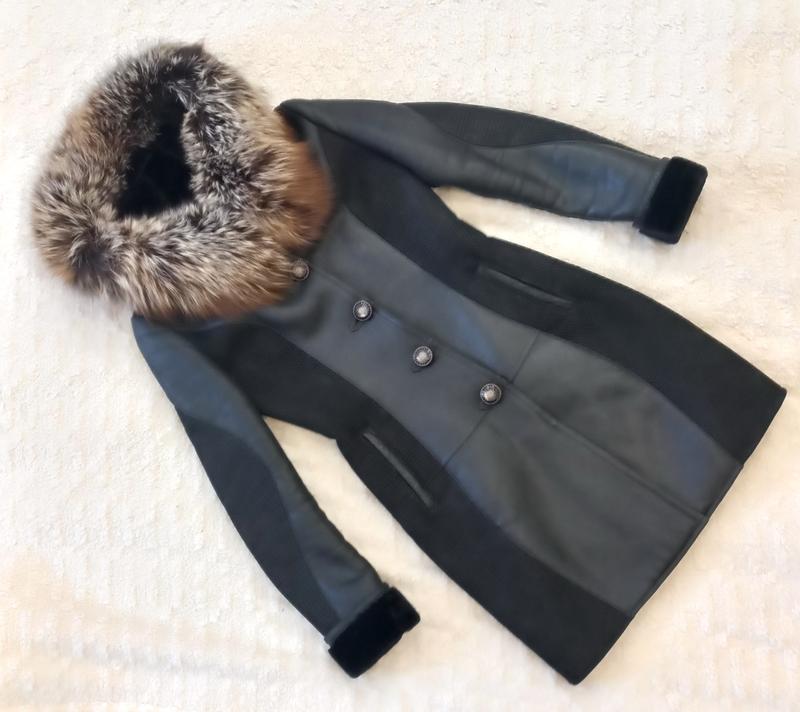 Очень теплая дубленка женская на пуговицах с натуральным мехом на капюшоне. Длина 89 см, длина рукава 64 см, ОГ 94 см, ОТ 82 см, ОБ 96-98 см