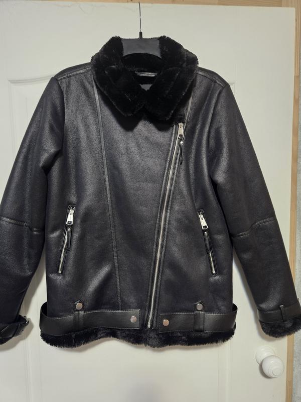 Эта куртка является черной курткой-дублянкой из искусственной кожи. Детали о куртке Тип: Байкерская куртка или куртка-авиатор (косуха). Материал: Изготовлена из искусственной кожи с подкладкой из искусственного меха, которая также видна на воротнике, манжетах и подоле. Дизайн: имеет асимметричную застежку-молнию, характерную для байкерского стиля, а также декоративные ремешки на воротнике и по низу. Сезон: Теплая модель, предназначенная для осенне-зимнего сезона.