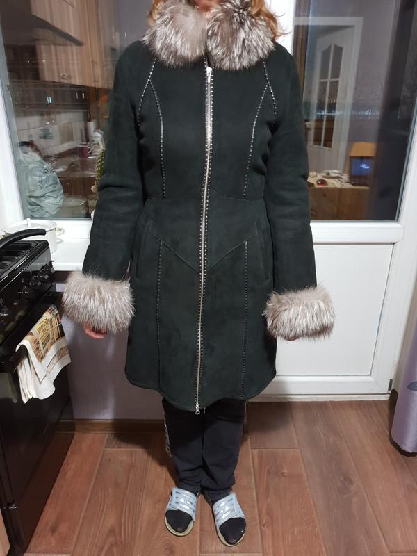 Дубленка из нубука цвета графит с меховой опушкой из натурального меха на манжетах и воротнике. Декоративный пояс-корсет. Одевалась пару раз в театр. Размер 44-46.