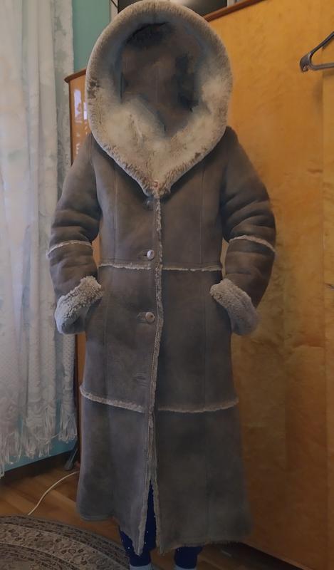 Дублёнка серо-коричневого цвета, ниже колен. На девушку рост 158-165 см