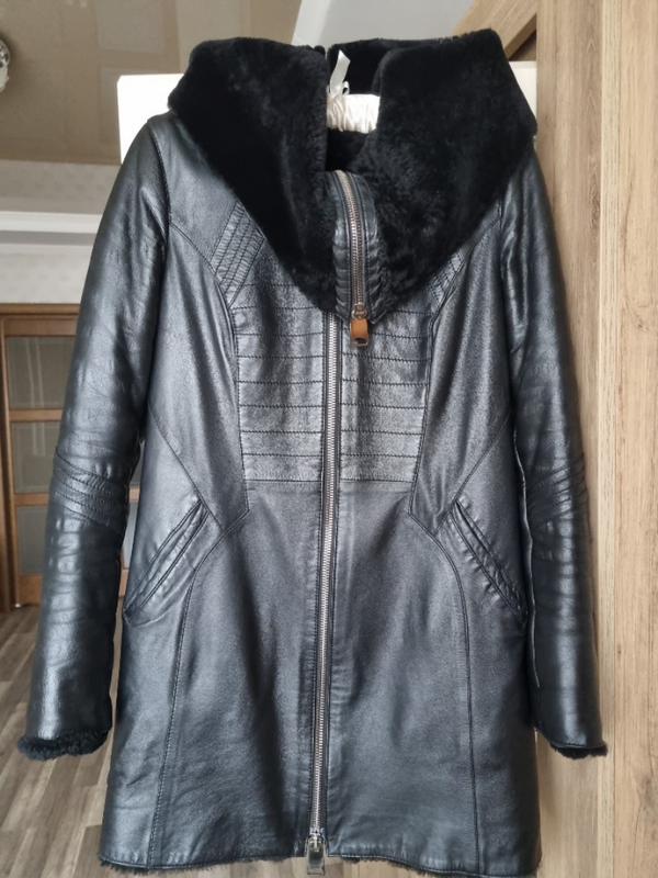 Дублянка жіноча дублянка з натуральної шкіри та з натуральним хутром всередині. Розмір 38 (S). Заміри: ширина плечей 36см довжина 80см ПОГ 46см ПОТ 42см Довжина рукава 62см (рукав можна підвертати при необхідності). Стан 4,5 з 5. Капюшон утеплений хутром з середини.