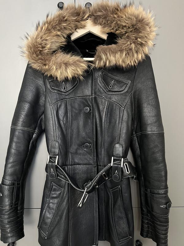 Натуральная кожа-верх,натуральный мех-внутри,тёплая,состояние идеальное.размер М,Яна с-ку тоже хорошо сядет,пояс подчеркнёт талию.