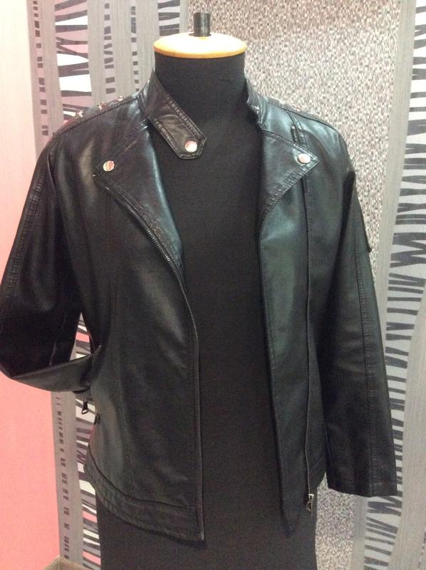 Дуже стильна молодіжна куртка із еко-шкіри. На плечах оригінальний декор. Куртка в ідеальному стані. Заміри по готовому виробу:по груді-92,по талії-86,по стегнам-88,довжина-61,довжина рукава-57.