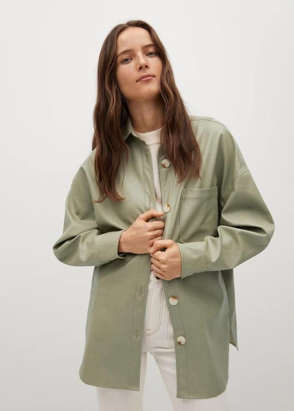 Куртка-піджак з шкірзамінника. Розмір XS-S Модель oversize Подовжена модель Довгий рукав з гудзиками на манжетах Плечі зі спущеними швами Кишеня з клапаном спереду Застібка на гудзики спереду Довжина 77 см Плечі опущені 62 см Рукав від шиї 73,5 см Півобхват під рукавами 56 см