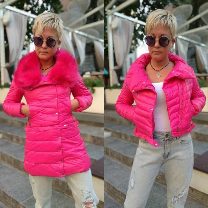 Куртка ТРАНСФОРМЕР Мех исскуственный, съёмный, Низ отстегивается и делается короткой курткой Наполнитель силикон Размер ХЛ (44),ХХЛ(46) Цвета: оранжевый, малиновый, голубой юроп Замеры трансформер: ХЛ- Ог 94-96 см Об 98-100 см Длина рукава 61 см Длина по спинке 74 см ХХл - ОГ- 96-98 см ОБ- 102-104см Длина рукава 62 см Длина по спине 75 см