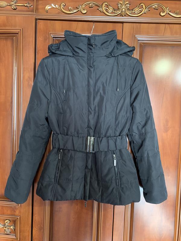 Утеплена куртка-вітрівка чорного кольору, з капюшоном. Пояс зйомний, з металічною пряжкою. Кишені на застібці. Капюшон з шнурком, на блискавці, зйомний. Манжет рукава - трикотажний, на застібці. Спереді - застібка блискавка. Стан ідеальний, без дефектів. Розмір - 44/М Пог - 48 см Пот - 42 см Поб - 52 см Довжина рукава - 63 см Довжина куртки - 69 см