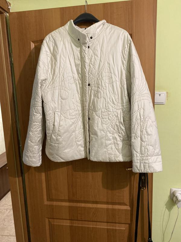 Куртка з плащовки молочного кольору і має пл собі бежеву нитку. Має легенький утеплювач. На осінь, не на мороз Пів об’єм грудей 60 І так до низу Довжина 72