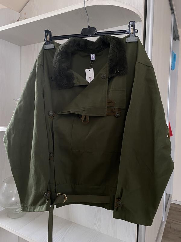 Курточка кольору хакі ( в стилі мілітарі). Тканина приємна, щільна; шви охайні та рівні. 1 нагрудний кишеню , робоччий. Сама курточка застібається на ґудзики. розмір М ( модель оверсайз) Плечі 53см ПОГ 58 см ПОБ 55 см (можна стрічкою регулювати в меншу сторону) Довжина 64 см Довжина рукава 52 см Лінія пройми рукава 26 см Стан новий, з біркою. Жодних дефектів. Склад поліестер і 5% спаднекс Річ, після отримання на пошті, поверненню не підлягає.