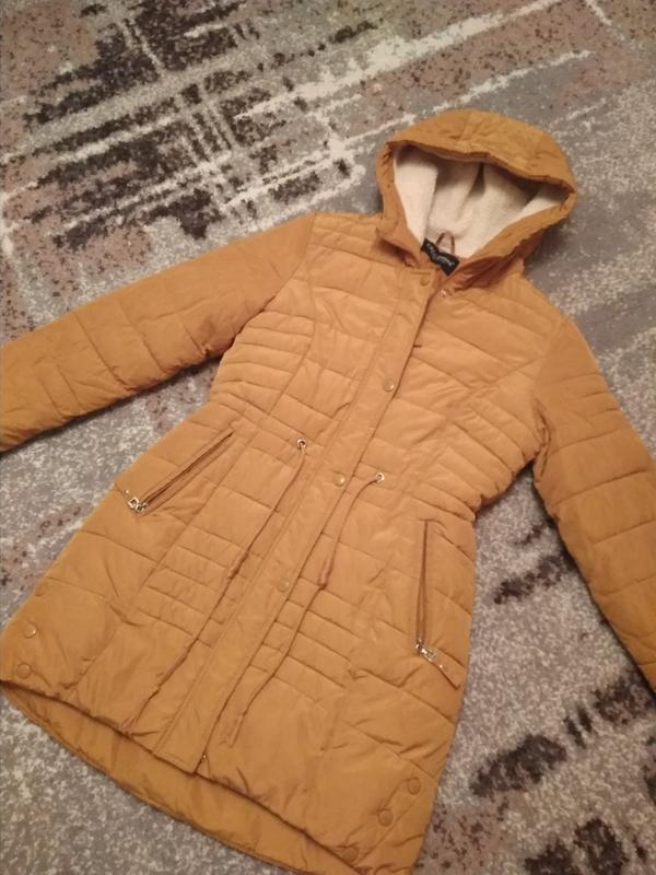 куртка зимова у відмінному стані, колір гірчичний, пояс стягується, замок робочий. З дефектів пару маленьких цяток коло правої кишені, при носінні не замітно, і трохи обтерта фарба на деяких гудзиках. Розмір ХL. Заміри при потребі надам.