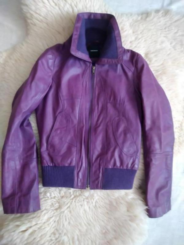 В гарному стані, фірмова, насиченого сиреневого кольору(незначні помарки зовні на рукавах, від зовнішніх факторів), носили один сезон, купували в стоці. Шкіра натуральна, на підкладі, з двома діючими карманами,, застібка - блискавка. Трикотажні вставки не розтягнуті. Розмір вказан s, заміри на фото.