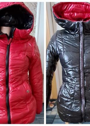 Пуховик двосторонній Можна носити в двох кольорах З капюшоном Під резинку 100% поліестер Розмір S Довжина рукава 62 см Довжина 76 см Напівобхват грудей 48 см Напівобхват талії 43.5 см Нижня межа 39 см, тягнеться до 50 см за рахунок резинки