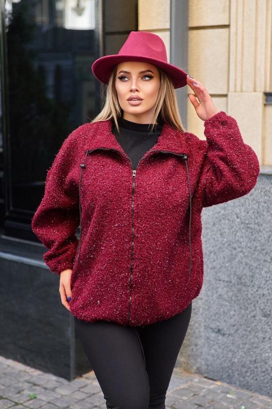 Куртка арт 05671.14 ціна 1000 грн Матеріал: букле з люрексовой нитью (м'яка, приємна тканина, 60% вовна, 20% віскоза, 20% полієстер) застібка - змійка, кишені. Підкладки немає, Параметри дівчини моделі 107/90/117, Зріст 165 на ній одягнений 2 розмір Заміри без урахування свободи облягання (вона повинна бути від 3-10 см, наскільки вільно вам подобається) 2 р - ОГ 120, ОБ 126 3 р - ОГ 140. ОБ 146 4 р - ОГ 160, ОБ 165 Размеры: 2 (48-54), 3 (56-62), 4(66-72)