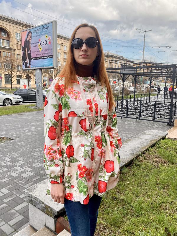 Куртка - плащик женская молодежная Подробнее на сайте Изделие высокого качества от известного производителя модной женской одежды . Соответствует всем нормам и требованиям лучшего мирового уровня одежды с использованием новых технологий компьютерного кроя , пошива и дорогой фурнитуры . Фабричное исполнение гарантирует безукоризненное качество и соответствие современным модным тенденциям . Курточка очень красивая , нежная . Ткань - плащевка , хорошее качество для ношения для каждого дня , что делает изделие очень современным и стильным . Плотная тонкая ткань с грязеводонепроницаемым покрытием , без наполнения , изделие для весны/лета/осени . Курточка - плащик приталенного силуэта , в белом цвете в цветах , с капюшоном , застежка на молнию и пояс , длинный рукав . На талии красивый пояс и кулиска . Длинна изделия является оптимальной современной моделью , которая хорошо комплектуется с брюками или юбкой . Эта модель подходит как для самой молодой девушки , так и женщине по старше . Шикарная современная демисезонная одежда . Стильная молодежная модель , мечта любой девушки . Хороший уровень исполнения изделия и мягкая , приятная текстура , с так же красивый презентабельный вид сделают его любимой одеждой для каждой женщины , и прослужит Вам длительное время . Для самых требовательных покупателей и ценителей качества . Размер: M-L