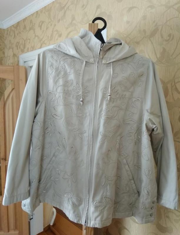 Дуже красива курточка з натуральної тканини, весна/осінь. Без дефектів, одягалась 3 рази. Довжина 75, рукав 63, від/до підмишки 66. Капюшон відстягується, по бокам і на манжетах є запонки, всі камінчики на місті.