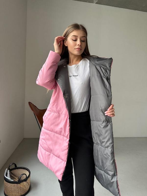 Куртка двостороння арт. min. 020 Ціна 1380 грн Розмір: 42-44, 46-48 Кольори: молоко-шоколад, синій-чорний, рожевий-графіт Тканина: плащівка "Канада" + силікон 200 Тепле двостороннє пальто. На кнопках у два ряди + пояс, є кишені. Силікон - це наповнювач, який не пропускає холод і не збивається при пранні.