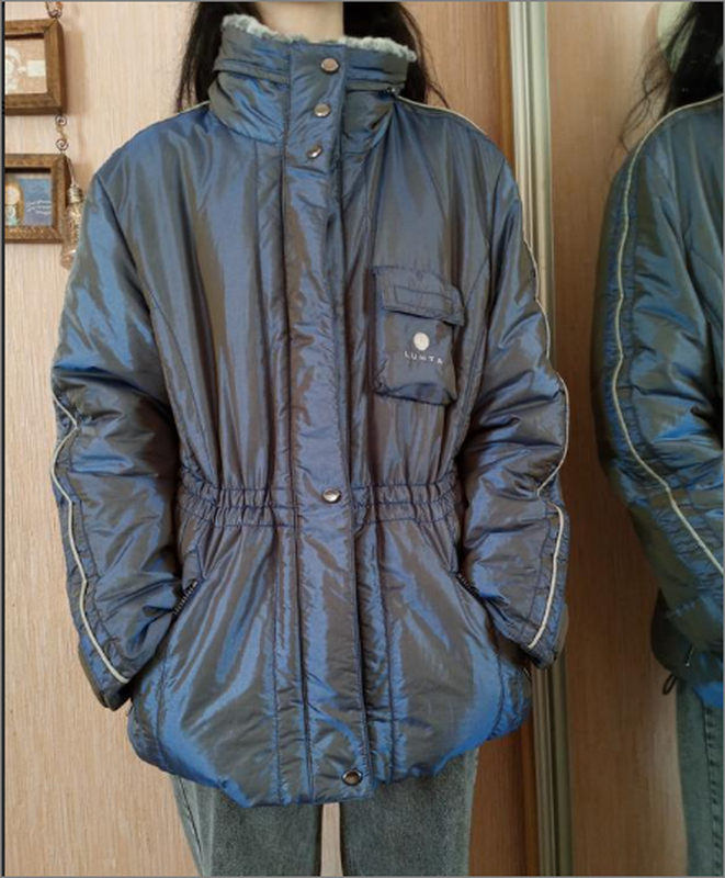 Для спорту і повсякдення Із ньюансів є плями на спині , але вона малопомітні (фото 6, 7 )так як курточка як хамелеона переливається, дуже гарний колір.в іншому як новенька Розмір L повномірна, одягнена на с