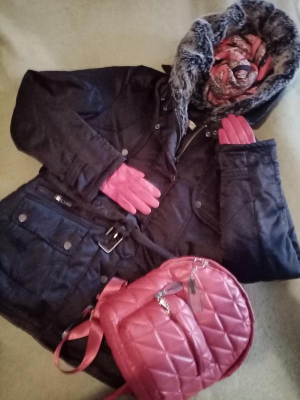 Куртка чёрного цвета из толстого атласа. Достаточно теплая. На синтипоне. В капюшоне и вдоль молнии, отстегивающийся мех. Оч удобная и практичная.