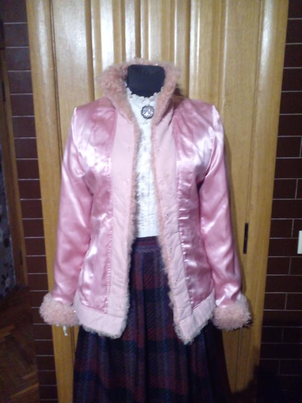 Фото на тілі немає. Повністю на гудзиках. Плечі і груди утеплені хутром кролика, рукава синтепоном. Хутро на декорі- баранчик. По тканині є трішки забруднення.