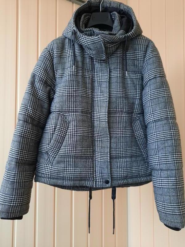 Куртка "Yessica "в клітинку з капюшоном. Спереду коротша,сзаду подовжена.Склад тканини:вовна,поліестер,акрил на синтапоні.Розмір S-M.Заміри по запиту.В гарному стані,одягала декілька разів.