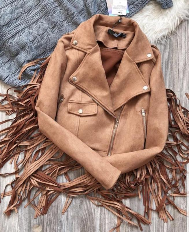 Модная куртка косуха в стиле бохо, богема, этно, бахрома, эко замш, латте
