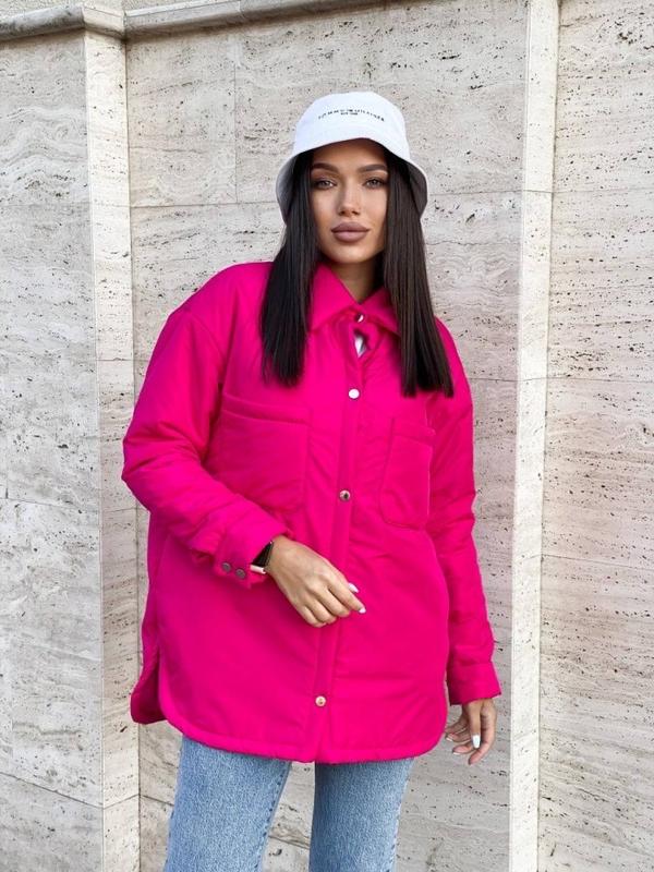 Женская куртка рубашечного кроя из плащевой ткани (100% полиэстер). Наполнитель – силикон 100 (до 0°). Два боковых кармана и два кармана на груди. Курточка застегивается на металлические кнопки, на рукавах манжеты также застегиваются на две кнопки. Плечи немного спущенные, куртка свободного кроя. Замеры Размер S- 42-44 ОГ 120 см Плечи 50 см Длина рукава 53 см Длина по спине 79 см Размер L- 46-48 ОГ 126 см Плечи 55 см Длина рукава 55 см Длина по спине 81 см