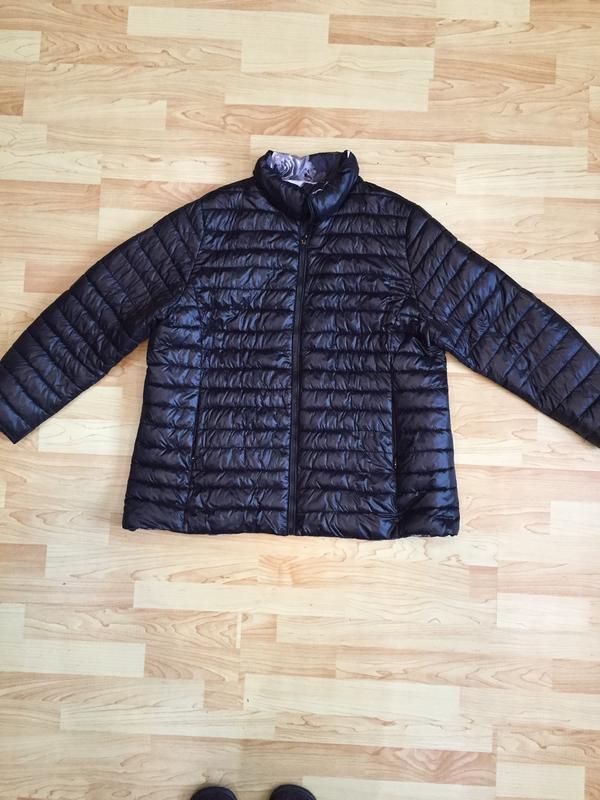 Женская куртка, двухсторонняя с одной стороны черная стеганая, с второй черная с цветочным принтом, объем груди 130см,талии-140см,длина рукава-64см, длина куртки-78см