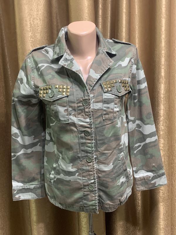 Камуфлированная Candy Couture джинсовая куртка/пиджак Цвет -зелёный/коричневый/светло-серый, тёмно-серый Размер на этикетке на возраст 10-11лет, подойдёт на размер xs- s Длина 61см Длина рукава от воротниковой зоны 65см Длина рукава от плечевого шва 51см Плечо 39см Полуобхват груди 43см Полуобхват талии 44см Полуобхват dбёдер 40-42см,тянется, встроенная резинка 4 кармана Застёжка пугавицы, на рукавах- кнопки Состав: 100% котон