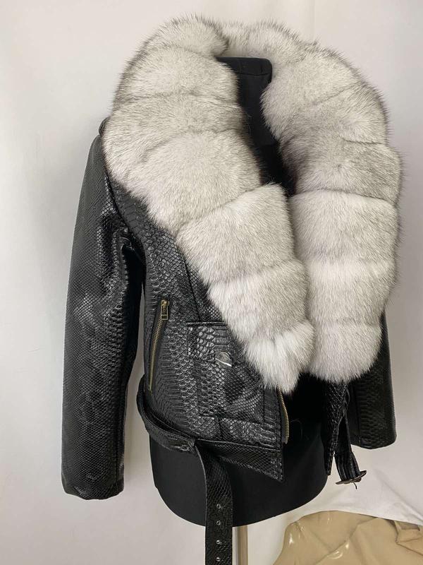 Женская косуха рептилия, кожаная куртка с натуральным мехом песца вуаль