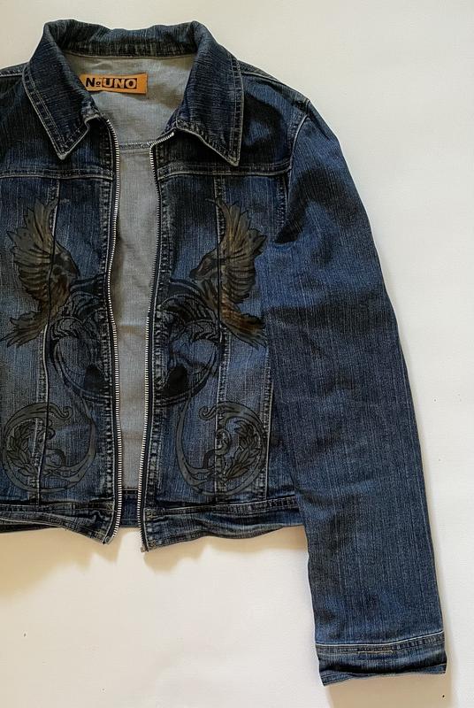 Отличного качества, с принтом, не очень плотная, ближе к рубашке чем к куртке; укороченная, состояние новой.