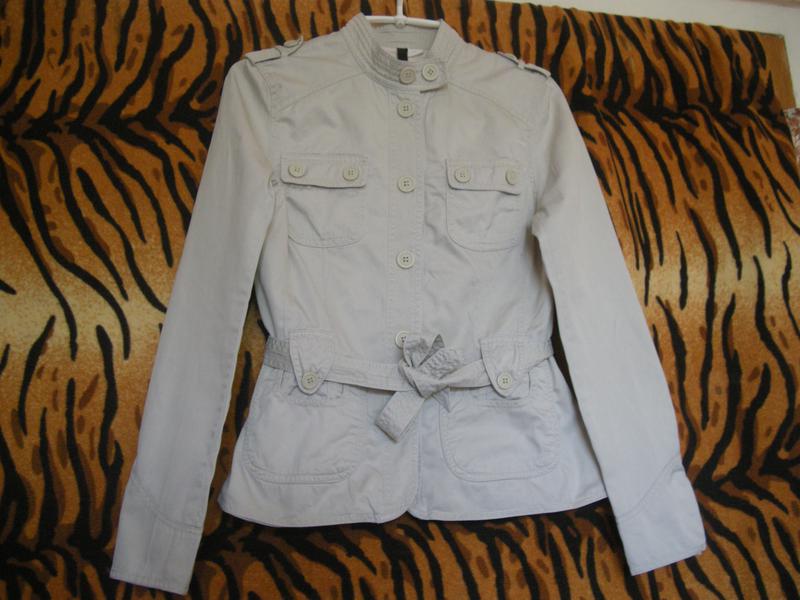Супершикарная куртка-пиджак светло-бежевого цвета,фирменная,натуральная,воротник-стойка,застежка впереди на пуговицы,на груди два кармана на пуговицах,внизу два кармана,на талии пояс,завязывается впереди,рукав внизу на длинном манжете с 5 пуговицами,нежно-розовая коттоновая подкладка,объем груди-88см.,длина рукава-61см.,объем талии-76см.,длина-56см.