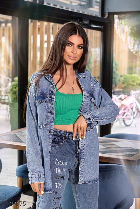 Джинсова куртка. Застегивается на металлические пуговицы. Ориентировочные замеры по готовому изделию: 42-44 (ОГ-106, ОТ-108, длина-75, дл.рукава-51), 44-46 (ОГ-110, ОТ-112, длина-75, дл.рукава-51), 46-48 (ОГ-114, ОТ-116, длина-75, дл.рукав-51)