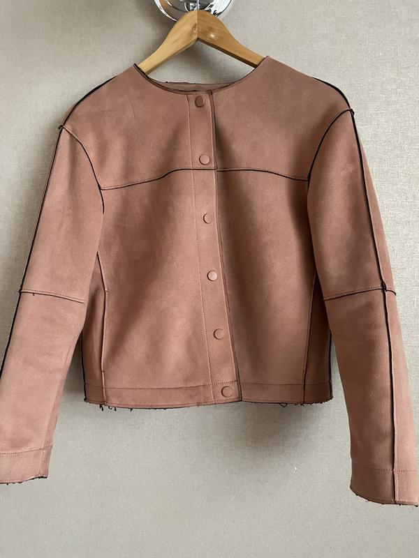 Легкая куртка-пиджак из искусственной замши. Приятного розового цвета. Есть дефекты на заклепках (потертость) и немного нити на рукавах. Все на фото