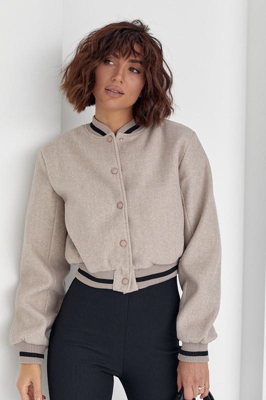 У модели прямой низ и длинные рукава дополнены манжетами из трикотажа в рубчик. Также у бомбера есть небольшой воротничок-стойка. Внутри есть тонкая подкладка без утеплителя. Застегивается изделие спереди на кнопки. Спереди расположены прорезные карманы.