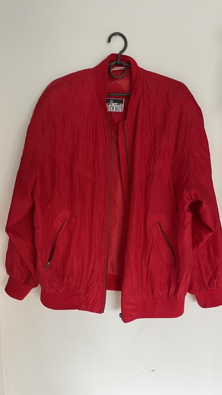 Куртка бомбер винтажная. Насыщенный красный цвет. Внешняя ткань шелк. Имеет маленькую затяжку (почти не заметная) Нуждает химчистки( есть небольшие пятнышки)