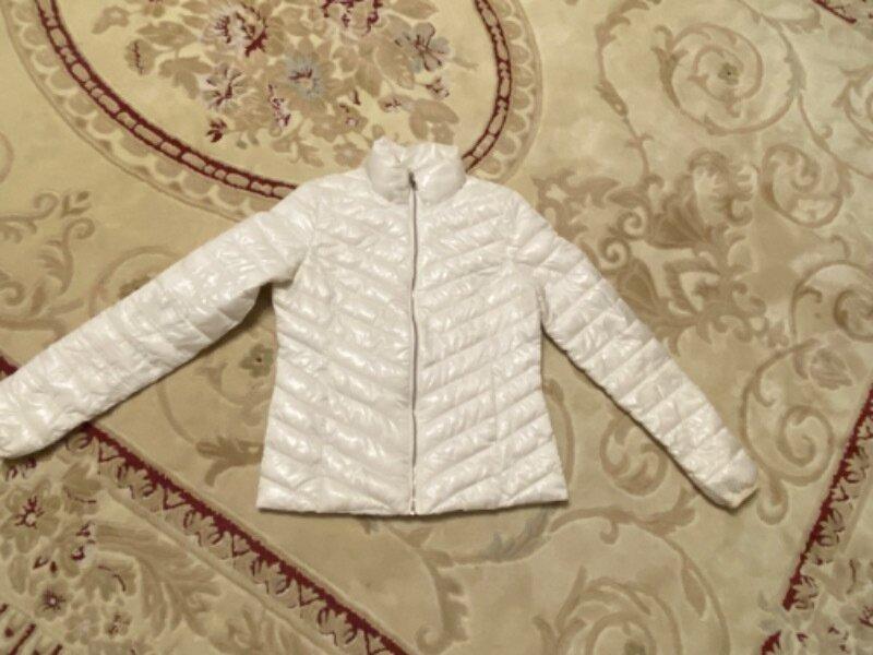 Курточка легкая, утепленная синтепоном, цвет белый, замочек серебристого цвета, размер С указано, наша школьница пару раз одала и выросла.Длина- 60см, плечи-38см, рукав от плеча- 65см, пог- 48см, пот-45см, поб-50см.