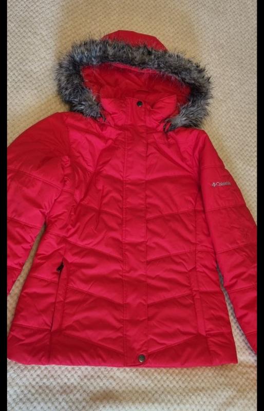 Куртка М Columbia ярко красная, капюшон на кнопках, может быть как лыжная. ПОГ 50, ПОБ 55, ДР 64, длина 62 см.Стан идеально