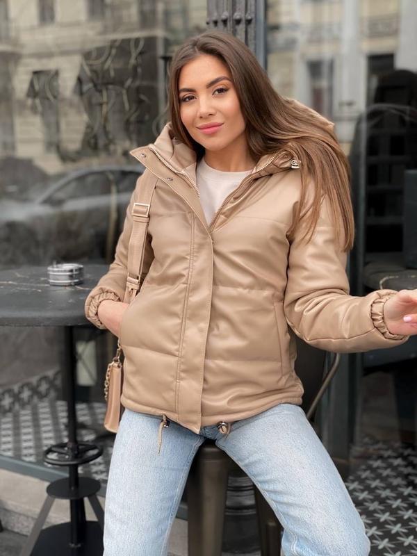 Куртка из эко-кожи на шнурочках арт. vm. 0103 Ткань: эко-кожа Наполнитель: силикон 200 Размеры: 42, 44, 46 Цвета: черный, кофейный, бежевый Длина по центру спины 63 см. Длина рукава 62 см. Длина от плеча до плеча 49 см. Фурнитура: кнопки, молния, блочка, шнурок внизу. Детали: планка впереди верха, сложный двойной капюшон. Очень качественная курточка. Замеры р.42/44/46: ОГ 98/102/106 ********** Длина спинки 63см Длина рукава 62см