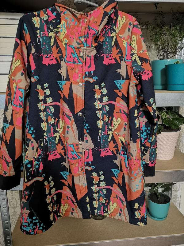 Цветная куртка с капюшоном в красивом состоянии. Ширина по низу 60 см, рукав 60 см, по комди 62 см, спина 39 см, общая длина 77 см.