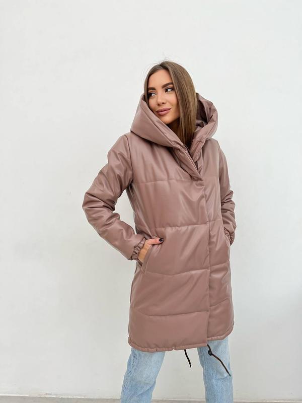 Курточка «зефирка Люкс» удлиненная на шнурочках! Ткань : экокожа Наполнитель : силикон 250 Размер : 42, 44, 46 Цвета: черный, серый, кофейный, бежевый Длина по центру спинки 88см Длина рукава 62 см Фурнитура: кнопки, молния, шнурок внизу Цена: 1280 грн