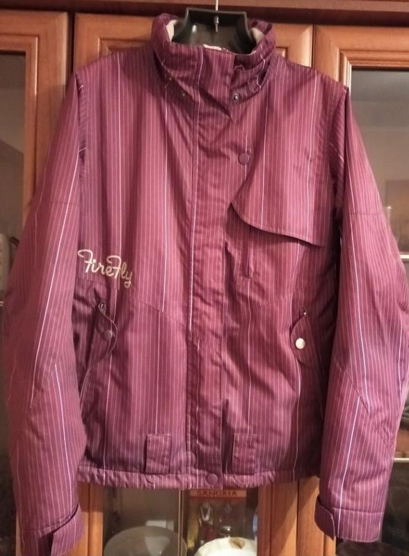 Женская спортивная термо куртка, бордового цвета в небольшую полоску. Идеальное состояние. Единственный минус затерянный тонкий капюшон. Очень теплая и непродуваемая, водонепроницаемая. Все замки, кнопки и липучки в идеале. Внутри на воротнике флисовая вставка. Многие карманы на молниях, подмышками тоже молния, которую можно расстегнуть, внутри сеточка для проветривания. Низ рукава на липучке для регулировки ширины. Внутри куртки застежка, на четвертом фото видно. Цвет, как на втором фото. Замеры: длина куртки 65, длина рукава 60, ПОГ 50, ПОТ 50, ПО низу 56, плечо от ворота до рукава 9, ширина от рукава до рукава по спинке 43 см. Хорошее состояние