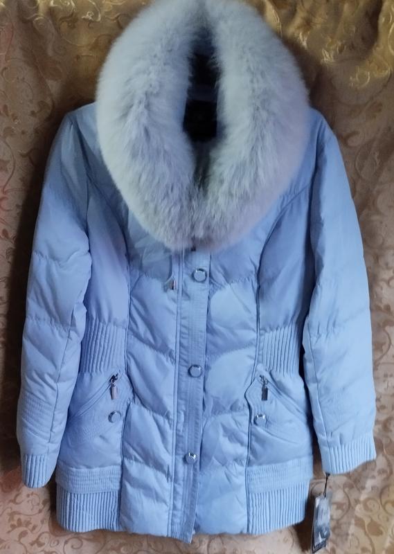 Куртка удлиненная на молнии и кнопках. Наполнитель пух перо. 2 кармана наружные на молнии и 1 маленький карман внутренний. Капюшон с мехом. Мех съёмный - натуральный песец. Цвет - светло голубой.. размер М/44. Длина- 82 см Полуобхват груди 49 см.