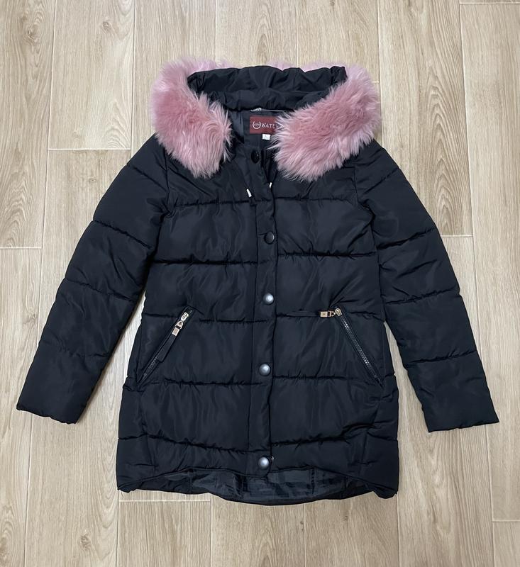 Удлиненная черная куртка с розовыми съемным пухом. Подойдет на размер S небольшую М. Длина 68 см спереди, сзади 76 см Рукав от плеча 58 см Полуобъем груди 45 см, талии 46 см, бедер 50 см