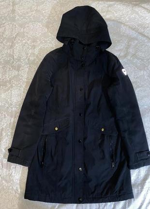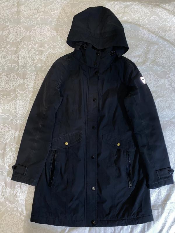 Куртка черного цевта с влагозащитной мембраной, ветронепроникаемая, с хорошей вентиляцией. Капюшон отстегивается, на заклёпках и есть утягивающая резинка. Куртка застегивается на молнию и заклепки. В районе пояса и в низу куртки есть резинка для затягивания. Внутри карман на молнии для телефона и протягивания провода от наушников. Впереди два кармана на заклепках и два кармана на молнии. Плечи - 43см, грудь- 56см, талия - 49см, бедра - 57см, длинна по спине - 86см, длинна рукава - 63см. Пишите в личные сообщения, отвечу на все вопросы, по желанию дополню фото