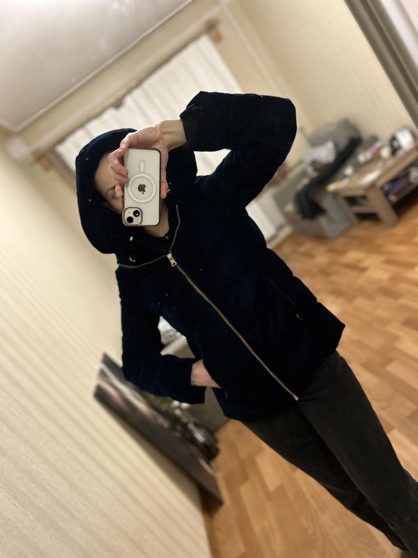 Пухова куртка Zara XS Одягнено на такі параметри: 164см Обхват груди: 90 Темно -синя, тканина оксамит В живую куртка выглядит лучше Имеет нюанс: внешне незаметный, но на фото виден (это небольшая потертость у кармана). Пригодную ее не видно