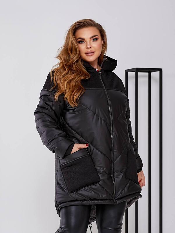 Розміри: 52/54;56/58 Тканина:плащівка стьобна на синтепоні 200+підкладкова тканина Заміри виробу 52/54 Ог-120 От-122 Ос-130 Довжина спереду-81 Позаду-95 Довжина рукава-64 56/58 Ог-132 От-134 Ос-142 Довжина спереду-82 Позаду-96 Довжина рукава-65 ас
