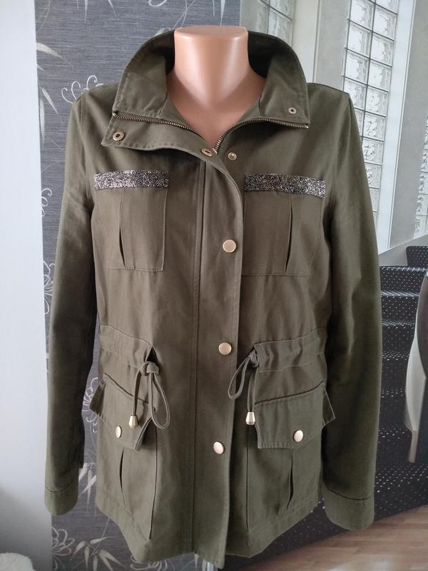 котонова куртка дорогого німецького бренду ELORA в мілітарі стилі з жіночними деталями ,що надає виробу родзинки. куртка на замку і кнопках. кишені на кнопках. нагрудні кишені декоровані бісером (поєднання непоєднаного на вістрі моди). розмір 36