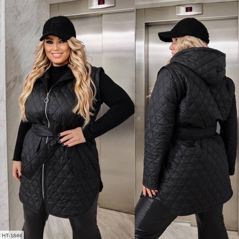 Куртка HT-1846 Ціна: 1035 грн. Розміри: 48-50, 52-54, 56-58 Куртка-жилет (трансформер) Функціональна куртка зі знімними рукавами Тканина: двостороння плащівка стьобана на синтепон 150 Заміри по тканині: 1 (48-50)-ОГ 108), ОС 124) 2 (52-54)-ОГ 122), ОС 132) 3 (56-58)-ОГ 136), ОС 138) Довжина рукава 62 см Довжина по спинці 90 см