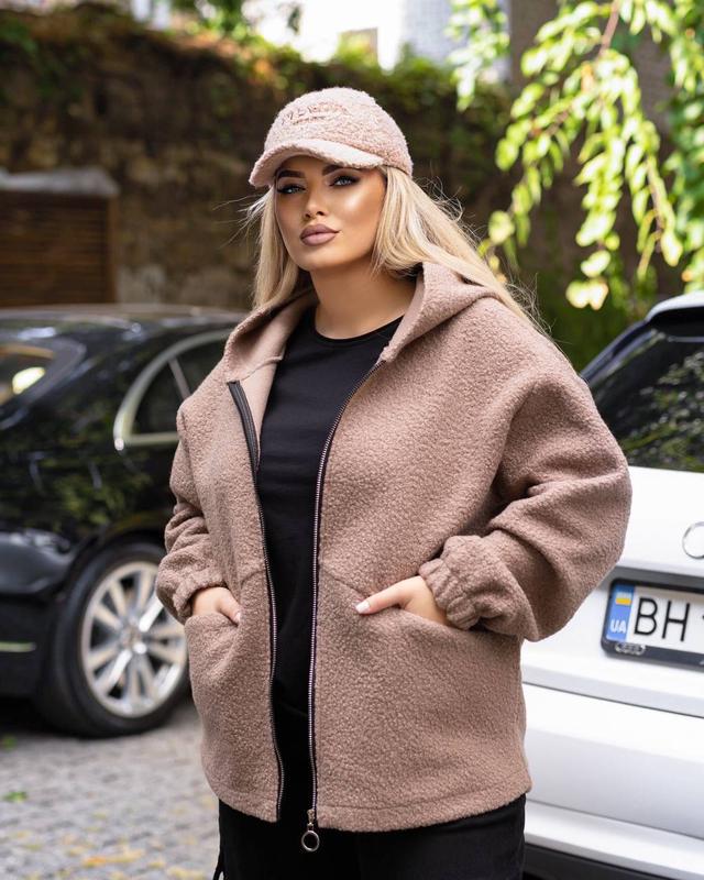 Тканина:барашек на кашемірі Розм:52/54,56/58 Колір: чорний,беж Тепла курточка з капюшоном,застібка -блискавка,з карманами,без підкладки. ———————— Заміри: 52/54: ОГ 128,ОС 128,рукав від горловини 75,довжина 72 56/58: ОГ 142,ОС 142,рукав від горловини 76, довжина 73 см
